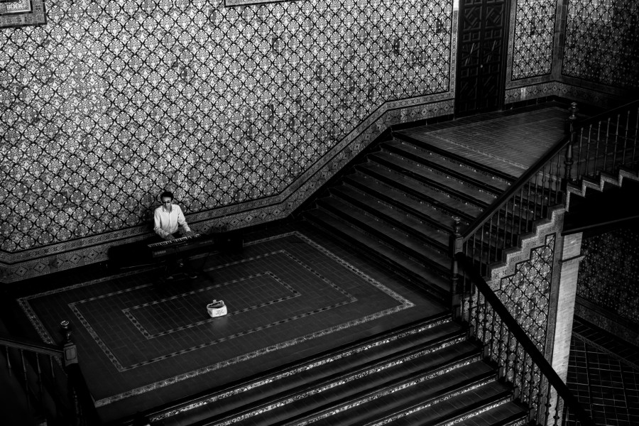 Ce pianiste jouait du blues seul dans cet immense escalier.